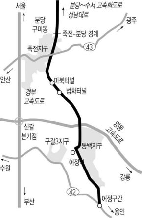 수원~신갈~용인을 잇는 42번 국도와 연결되는 이 곳에서 죽전까지는 10㎞. 신호등 2~3개만 없으면 고속도로나 다름없다. 왕복 4차선 도로는 ‘제한속도 시속 70㎞’가 무색할 만큼 시원스레 뚫렸다. 동백 한가운데 쯤인 어정역까지 2개의 지하차도가 연결돼 채 5분이 안걸렸다.