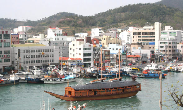 경남 통영의 한 조선소에서 두달여간의 수리를 끝낸 한강 거북선이 17일 오전 한산도 앞바다에서 시험운항을 한 뒤 통영항으로 입항하고 있다. 통영/연합뉴스