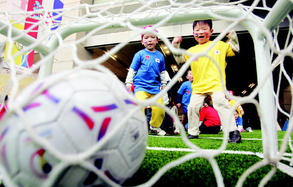 과천시립 어린이집 아이들이 6일 오전 경기도 과천 코오롱타워 별관 1층 로비에 마련된 모형 인조잔디 축구장에서 축구경기를 하고 있다. 에프엔시(FnC)코오롱이 월드컵 대표팀의 선전을 기원하려고 로비에 설치한 모형 축구장은 코오롱 글로텍에서 자체 개발한 인조잔디로 꾸며졌는데 일반에게도 개방될 예정이다.