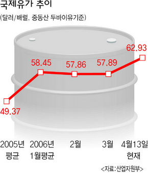 중동산 두바이유 기준 국제유가는 올해 1~3월에 평균 58달러선이었다가 4월 들어서는 이란의 핵개발 강행 가능성이 커지면서 60달러선을 웃돌고 있다. 올해 연평균 유가를 53달러로 예상한 정부는 이런 고유가 상황이 지속되면 경제성장에 큰 타격을 줄 것으로 우려하고 있다.