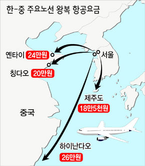 산둥성 옌타이와 인천 노선은 45만원에서 24만원으로, 대표적 휴양지인 하이난다오의 싼야와 인천을 오가는 운임은 55만원에서 26만원으로 각각 낮췄다. 항공편 숫자도 대폭 늘려 칭다오-인천과 옌타이-인천은 주 4회와 9회에서 각각 30회가 됐다. 중국국제항공, 중국남방항공 등 다른 중국 항공사들도 다음달부터 한-중 노선 요금을 대폭 인하할 전망이다.