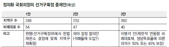 ■ 향후 절차 정 의장은 여야 합의 불발 시 대안으로 세 가지 안을 검토하고 있다. 이 중 하나를 선거구획정위원회에 제시할 것으로 보인다.