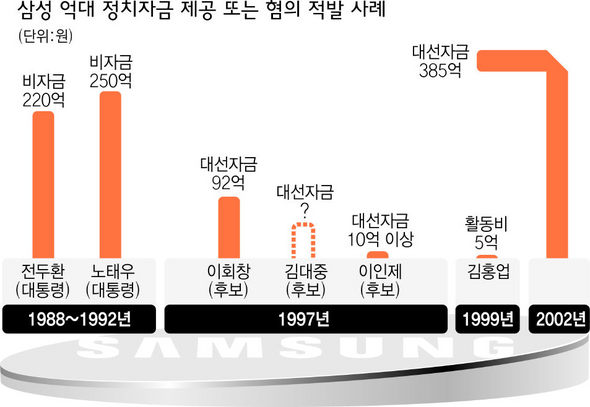옛 국가안전기획부(현재 국가정보원)의 도청 테이프 사건을 계기로 삼성이 운용하는 막대한 규모의 비자금에 관심이 쏠리고 있다. 테이프 녹취록을 보면, 삼성이 1997년 당시 유력 대선 후보들에게 건넨 것으로 돼 있는 대선자금 규모는 문건에 나오는 것만 100억원을 넘는다. 액수가 확인되지 않는 것까지 합하면 이보다 훨씬 많을 것으로 보인다. 삼성이 역대 정권의 유력 정치인들에게 은밀하게 건넨 돈은 대부분 정상 회계처리를 하지 않고 계열사들로부터 조성한 비자금이 원천이다. 정확하게 말하면 구조조정본부가 삼성 계열사들이나 계열사 주주들의 돈을 빼내 자기 돈처럼 마음대로 굴린 것이다. 녹취록서 드러난 대선자금 100억 ‘훌쩍’
